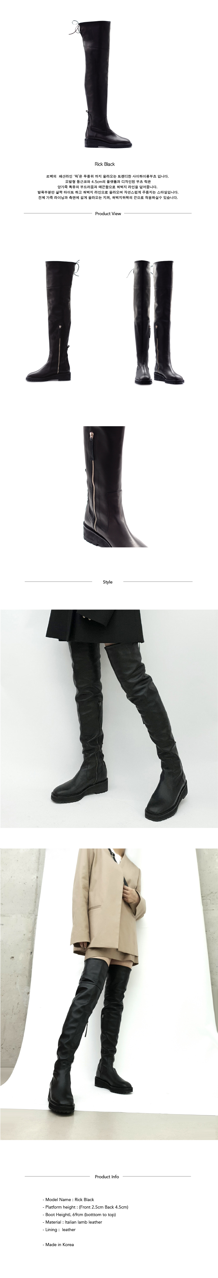 릭은 다리라인에 맞는 완벽한 핏감을 선사해 더욱 날씬하고 길어보이는 효과를 주는 싸이하이 부츠입니다. 허벅지 중간까지 올라오는 심플한 라인과 통굽 마무리는 모던함과 편안함을 동시에 선사해 데일리용으로도 완벽합니다.